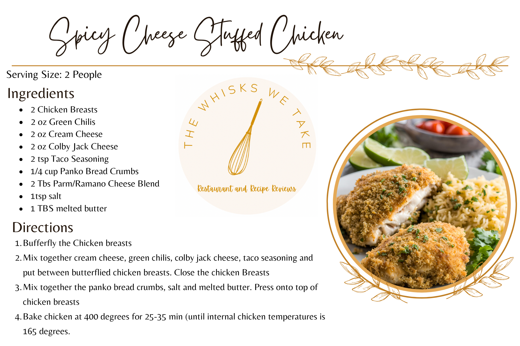 In a separate bowl mix together the panko bread crumbs, salt and melted butter. Press on top of stuffed chicken breasts